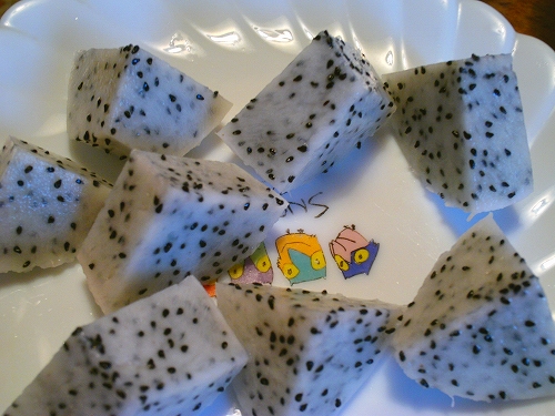 いちいち太字にでもしないとそろそろ死亡確認!とか言われそうで太字にしてみたがよく考えたら王さんの死亡確認!は生存フラグだったっていう罠。 さて盆です。 盆って言っても我が職場には盆なんてないです。 盆?何それ覆水戻ってこないよ?っていうレベルで盆なんて知らんです。 今年は今日がぎりぎりだったんでよかったですが来年は休めないですね。盆に休めないと墓参りも親戚回りもなんにもイベントできないんでせいぜい夜に送り火とか迎え火焚いて花火する程度だと思うんですがこの職場最悪夜中の2時終業とかあったりするんでそれすらできなかったりする可能性ありますね。 盆に休めないのが不便とは大して思わないですがホトケ様に若干申し訳ない感じですね。 盆に休めない分は後日に夏季休暇が5日程度あるという話を聞いたんですがその5日のうち1日は日曜でもともと休みでその上この企業は週休2日なもんでまあ見積もって夏休みは3日ですね。使役しすぎだろ常考…。 この調子だと冬休みは正月3日まででしかもそのうち1日は日曜とかいう悪夢が押し寄せると思ったら来年の元旦が日曜ですね。代休くれよ。 いいえ竜的果実なんかじゃねえです。 もうしばらくドラゴンフルーツはいいとあれほど言ったんで今日は別の南国果実の話。 なんかここ北日本なんですけど南を彷彿とさせるビニールハウスがありましてですね。まあそういう所に行く機会があったわけです。 んで、そこで色々見てきたんですが写真とりすぎて収拾つかねえんでとりあえず一番身近な南国果実に話を絞ってお送りしたいと思います。 正面に見えますは一面のBA☆NA☆NA畑でございます ビニールハウスの手前から奥まで見渡す限りのバナナの木。絶景かな。 バナナって木になるモンなんですね。いや図鑑で見たことはあるけど実際見る機会ってそうないんで勉強になりました。 一本もいで食べたかったが青かったんできっとまずかったろうと。その前にこういう場所のモン勝手にもいじゃいけないって思えよ自分。 んで、こいつがBA☆NA☆NAの花。 なんかバナナっていう割にこの花の知名度恐ろしく低そうですね。 ぱっと見たらラフレシアの親戚に見えるレベルだけど悪臭放つほどのキワモノでもないんでまあ、観賞には全く向かない程度の花っていう感じの。花の価値は鑑賞に向くか向かないかっていうものに限らないけど鑑賞に向かない花っていう時点でわりと酷いこと言ってる気もする。気がするだけならタダだ。 他にも情熱的果実とか竜的果実の花らしきナニモノかとか空気植物とか巨砲とか色々あったんですけどまたの機会に。 次の記事で続きやるかどうかは不明瞭ですがね! また懲りずにドラゴンフルーツ買ってきたよこの人。 またってのは以前もこのあたりでこんな植物買ってきて食べたレポートしたわけですがまーた店頭に並んでるの見て「あー久々に食いてーなー」とか思った末にこうなった。反省はしてなかった。 まあ、買ってきたし追熟ナシの即食可能物だったため早速裁断。 若干胡麻豆腐に見えなくもないが果肉。 さて、味は。 ザー............。 …味ないってレベルじゃねーぞ! いくら薄味派だろうが許せないレベルの味の無さっていうか単純な不味さに行き場のない怒りを抱えつつも最悪ジュースにでもすりゃ飲めるかと思ってイチゴと牛乳とついでにガムシロップとともに撹拌してみたがなんかイチゴだけの方がまだマシっていうレベルのシロモノができあがって要するに青臭くて無駄にでかくて量も多い種がテラ不味い。裏ごしすりゃいけるかもと思ったもののそこまでする気力もなく「いやこれ美味しいよ」と言っていた家族に譲り渡して終了。 前のヤツはまぁまぁ美味かったからこれ自体が不味いなんてこたぁないと思うわけだがしばらくドラゴンフルーツはよくなってしまった。おっちゃん、イチゴちょうだい。 | 次のページ>>