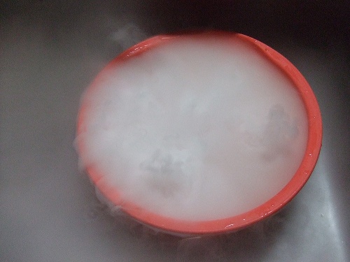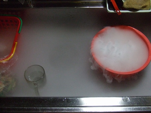 色々喋りたい気もするんですがね、何しろあんまりベラベラと喋繰っていると個人特定されかねませんからね。 ですんで風景とかそこらの小動物とかテキトウな自然写真とかそういうものが多めのこのブログですが、今日は自然物でもないしかといって身バレもしないという魔法の固体ドライアイスをお届けします。 投下直後。 わが家ではドライアイスを溶かす時に水に入れず湯(最低でもぬるま湯、ノッている時には熱湯も可)に入れるという妙な習慣があるため、ドライアイス投下時の爆発感が凄い。まあ写真なので爆発感も何もあったものでもないわけですが大体こんな感じギャグマンガ日和。 まあ熱湯だろうが-50℃のドライアイスに勝てるわけもなくそのうち水になってるんでしょうが手を投入する勇気はない。 投下後少ししてからちょっとヒキで撮ってみた。 何この結婚式場。まあ結婚式場でドライアイスを使っている場面なんてテレビでしか見たことありませんがね。 ドライアイスの煙が二酸化炭素ということで、こいつを吸ったら死ぬと思い込んで必死で換気してた頃が懐かしいですね。ちなみに二酸化炭素を吸ったら死ぬのではなく吸い込む空気の中の酸素量が不足すると酸欠するというだけの話。どっちみちあの煙だけ吸い続けたら死ぬわけですが換気しなきゃいかんほどの毒ガスでもない。 名探偵コ○ンではドライアイスを部屋に流しこんで、睡眠薬を飲ませた奴を窒息死させるとかそんな手法があったと思いますが、まぁ一般的知識じゃないですね。むしろやったら逮捕されるのでマネしないように。 それを言うならALIVEですかね。こんばんは。